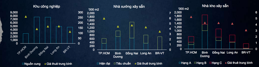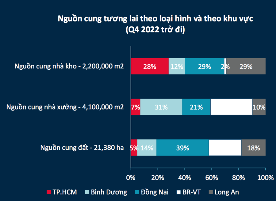 Nguồn cung khu công nghiệp tương lai khu vực phía Nam, đạt khoảng 21.280ha, nguồn cung nhà xưởng đạt, 41, triệu m2, nguồn cung nhà kho tương lai đạt 2,2 triệu m2.