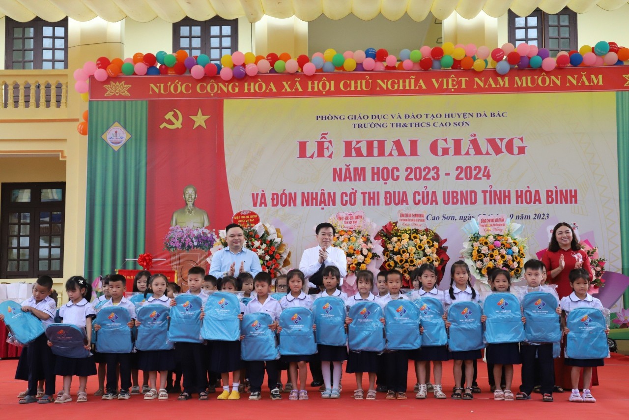 Hình ảnh Chủ Tịch Tập Đoàn Win Holdings lên trao tặng cặp sách cho các em có hoàn cảnh khó khăn tại Trường TH&THCS xã Cao Sơn huyện Đà Bắc.